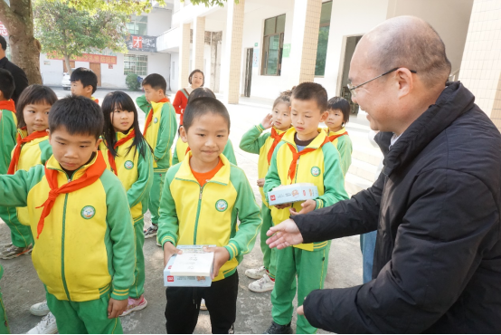 在山下小学的广场上,王红、傅鹤鸣与山下村小学校长黄金浓、驻村第一书记杨振宇,共同为“饼干姐姐