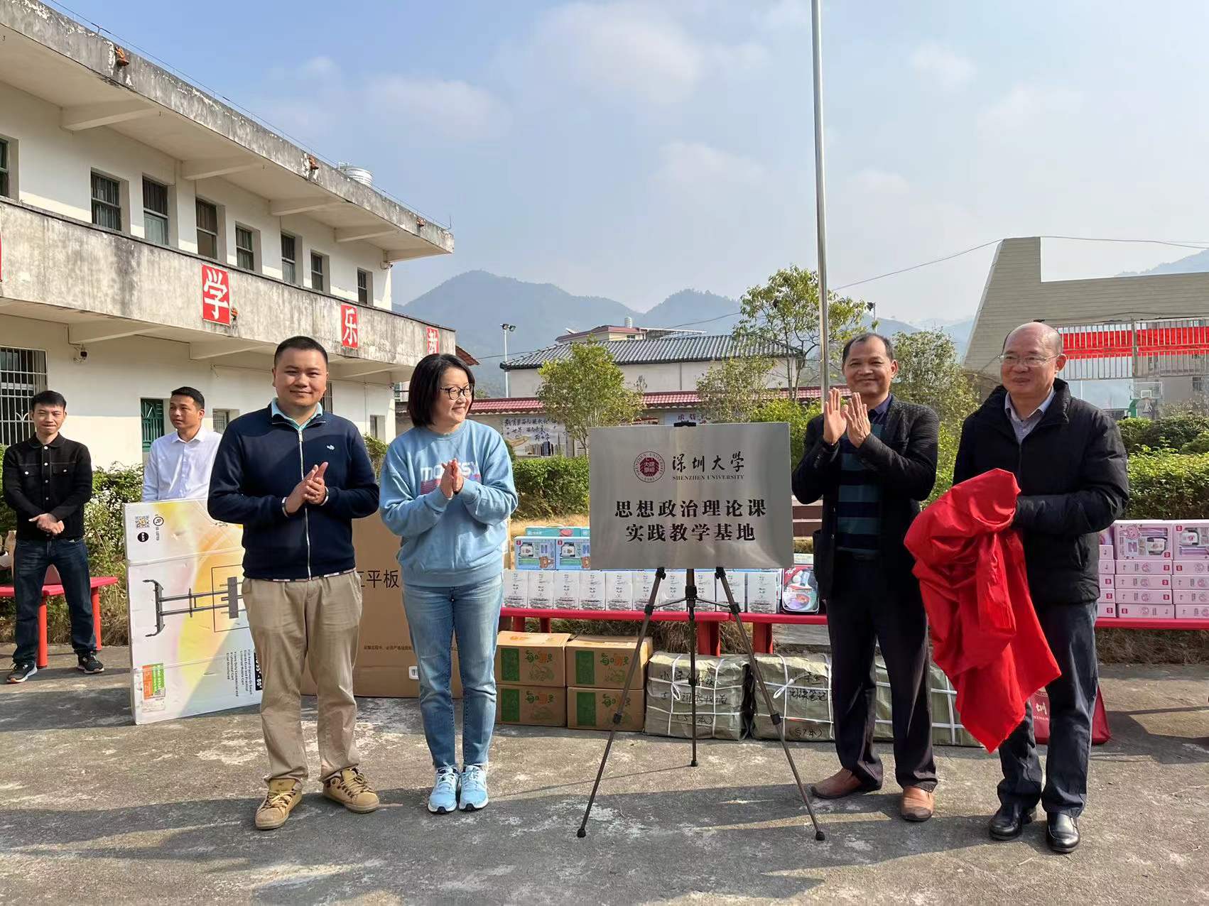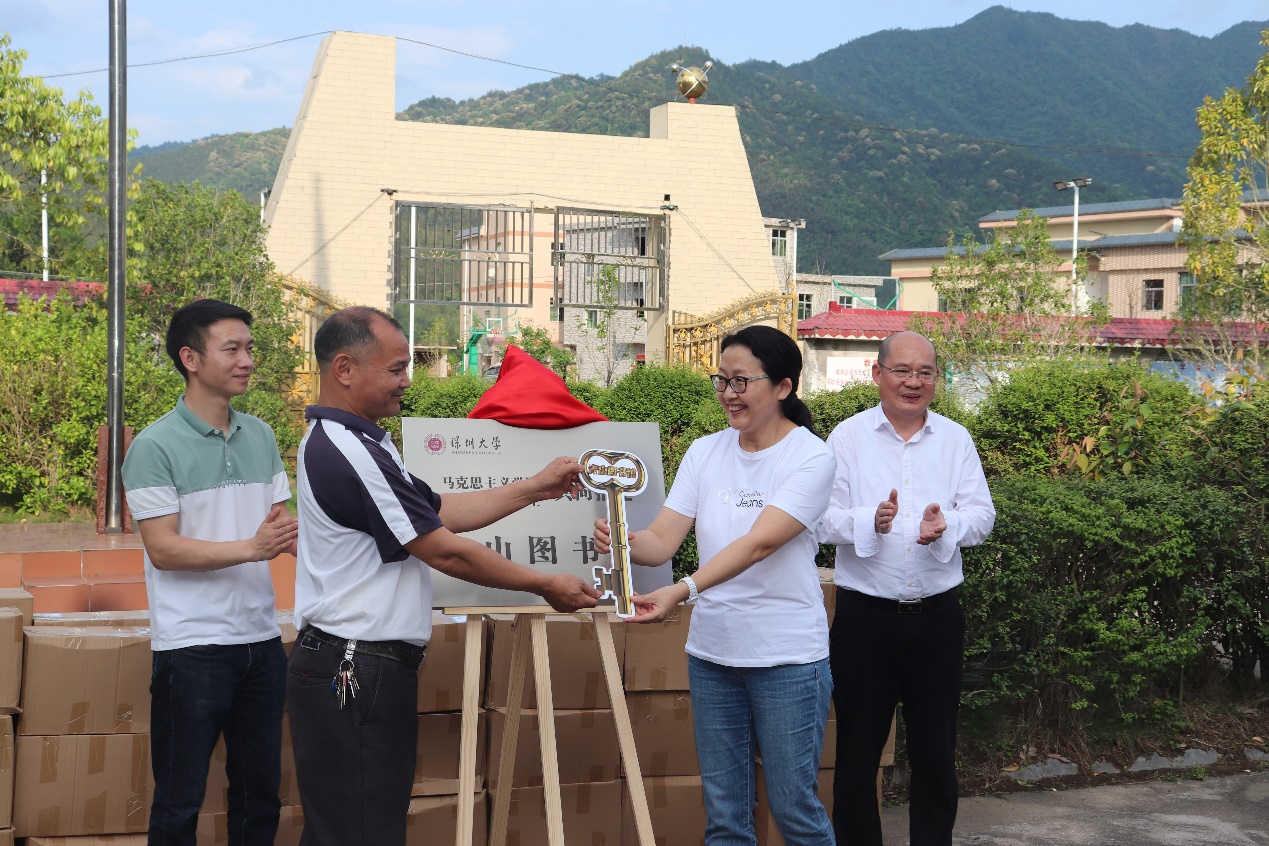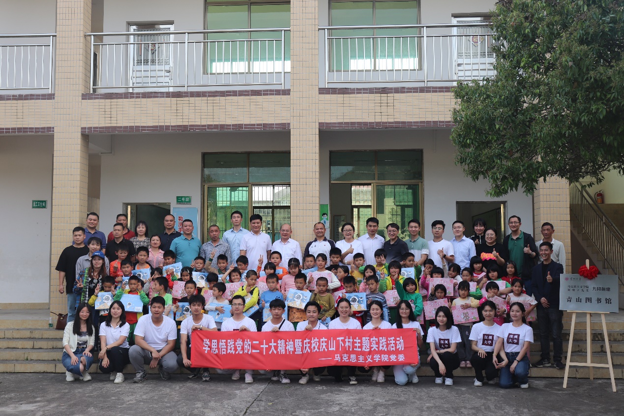 师生大局贡献意识和理论服务社会能力,于4月20日组织学院师生党员群众赴河源市和平县浰源镇山下村,在山下小学举行“青山图书馆”交钥匙工程捐赠暨揭牌启用仪式,捐赠图书2324本和体育用品一批,向山下小学52名孩子每人赠送一份学习用品。学校党委常委、学院党委书记王红、院长傅鹤鸣、副书记陈一鸣、思想政治理论课教师、思想政治辅导、党建组织员、研究生党员、入党积极分子等30名师生参加,浰源镇人大副主席、山下村工作组组长刘剑艺,山下村党支部书记、村委会主任邹海飘,浰源镇乡村振兴工作队队长、团市委干部王炜炜,浰源镇乡村振兴工作队副队长、山下村第一书记、饼干姐姐