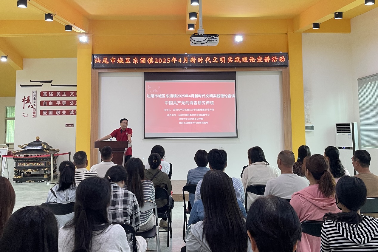在东涌镇新时代文明实践所,李升涛助理教授给当地党员、群众代表做了一场题为《中国共产党的调查研究传统》的宣讲报告。李升涛首先讲述了“没有调查,就没有发言权”的来历,用以点明中国共产党十分重视调查研究。然后,重点讲述了毛泽东在“井冈山时期”和“三大改造”期间的调查研究。宣讲当中,李升涛不时结合日常生活中实际例子说明如何召开座谈会,如何解剖麻雀。