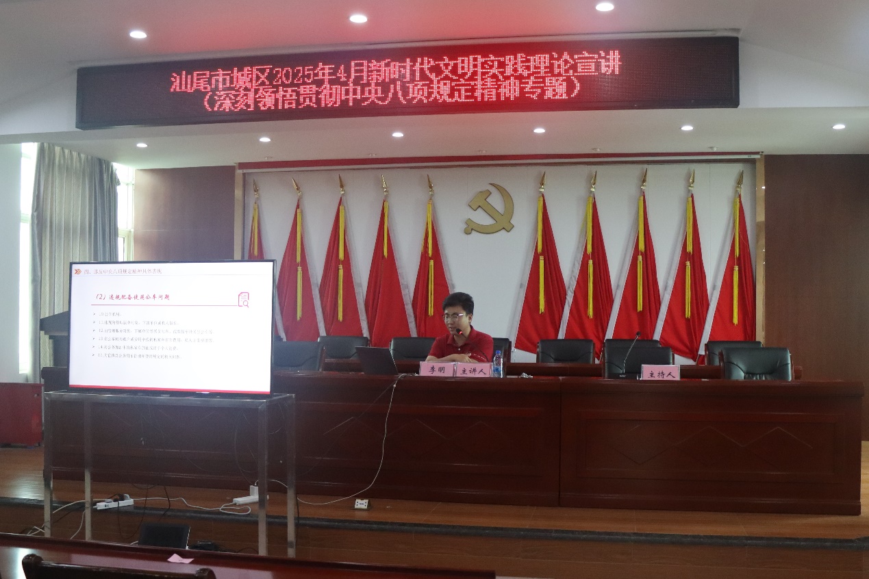 李明助理教授在凤山街道新时代文明实践所围绕《深刻领悟中央八项规定精神》作了专题宣讲,带领基层党员干部和群众代表回顾了中央八项规定提出的原因及其内容,深入阐述了中央八项规定精神的实质、意义和违反中央八项规定精神的具体表现,并结合党中央部署的深入贯彻中央八项规定精神学习教育,提出来基层党员干部和群众如何从自身做起认真贯彻落实中央八项规定精神。